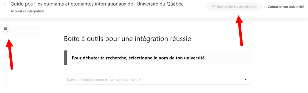 NAVIGATION : Il est possible de rechercher l'information, par thématiques, dans la table des matières située à droite de la page, ou en recherchant par mots-clés, via le moteur de recherche situé en haut à droite de la page.